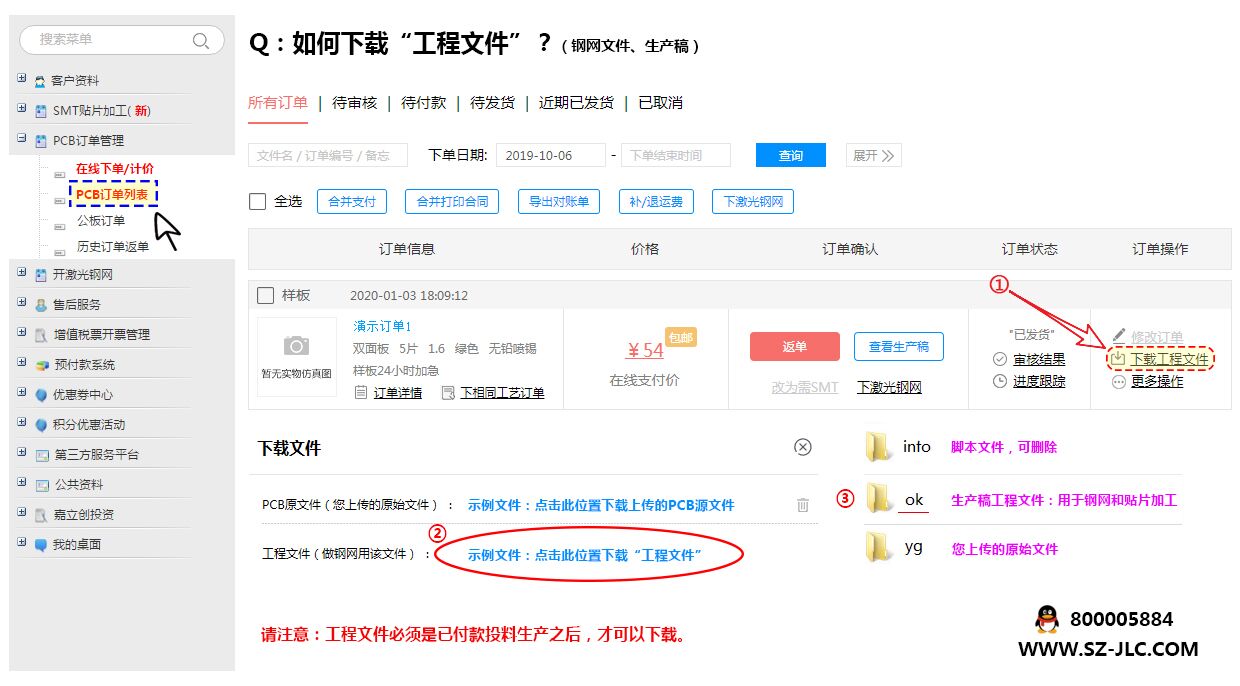 您好,在PCB订单列表里面,点击下载工程文件,保存,下载解压之后里面的OK文件夹(可做钢网、用CAM350打开直接导入就可以)就是 YG文件是您的原始文件。