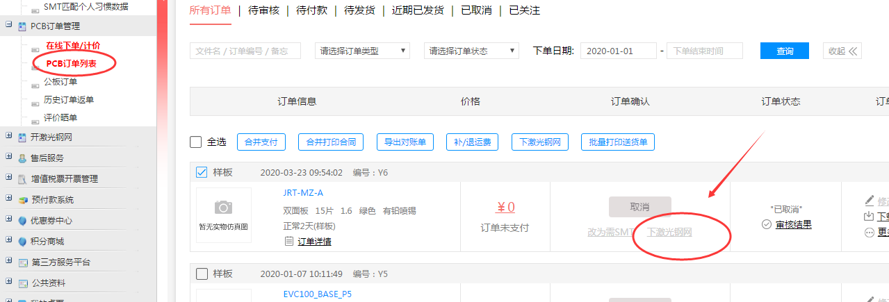 您好,请在PCB订单列表中,在对应的PCB订单里点击下激光钢网下单即可。