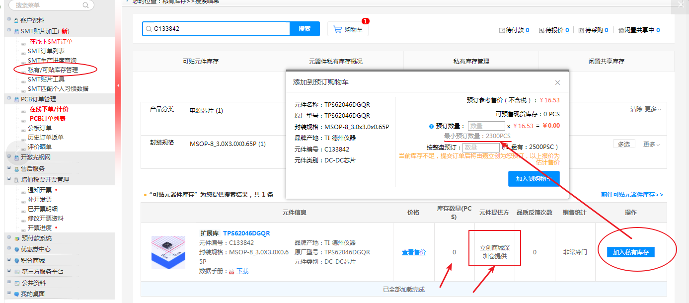 或者加入私有库存,加入私有库存要先预定元器件付款,我司采购买物料回来入库,您下单的时候用您的私有库存可以下单。