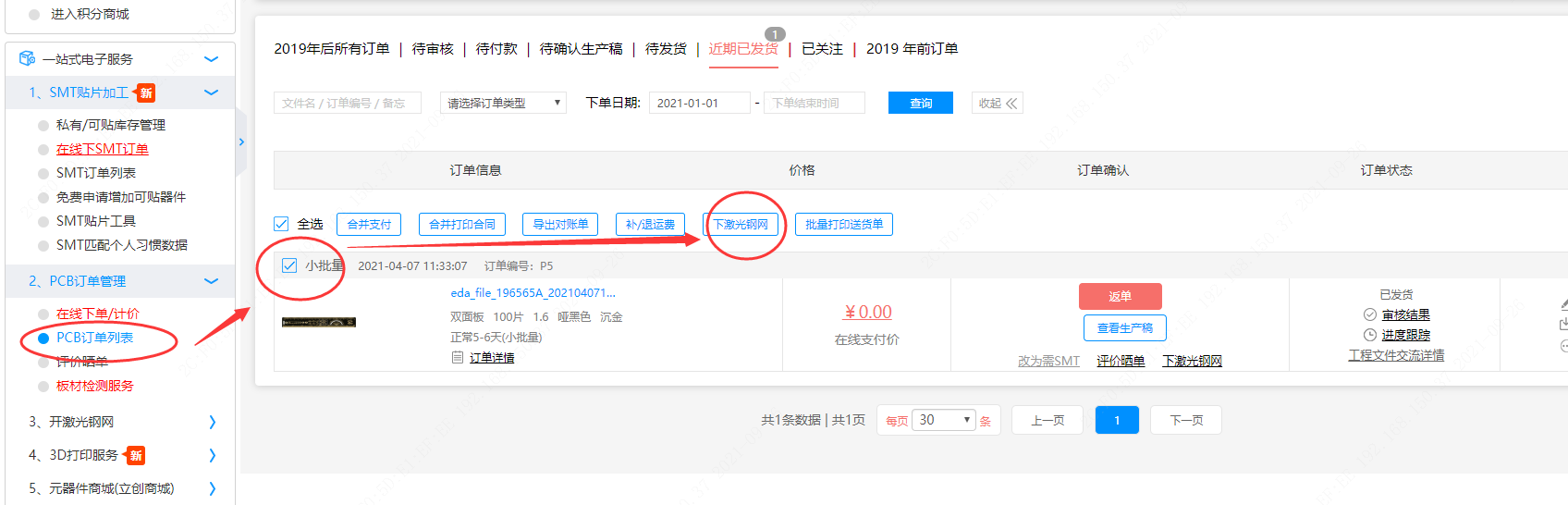 之前做的板需要激光网,但是下不了单,请问怎么操作