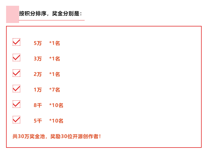 星火计划以「资助项目」为主,为了全民参与,把气氛搞起来,特别设立奖金鼓励!评选规则简单直接,必须是大家选择出来的,采用积分机制,从高到低,选择出30位,并颁发荣誉奖杯!